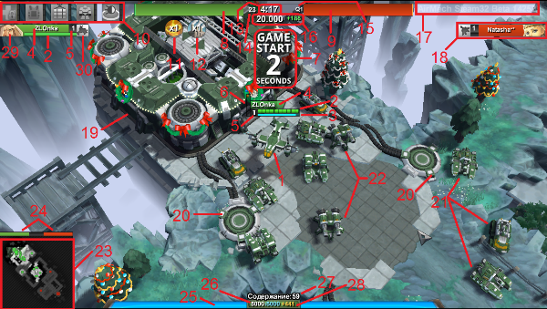 4. Время одного стандартного матча в игре - 30 минут + овертайм. Через каждые 5 минут от начала игры и до 20й минуты, увеличивается уровень Ваших крипов и производственные мощности. Лучший способ быстрого продвижения и захвата по карте - помощь своим крипам. Для этого Вы можете, начиная с первых предстартовых секунд строить технику, высадить её на границах допустимой зоны, дать приказы по захвату строений или атаке сил противника, а также, если это необходмо задержать их, создав препятствие каким-нибудь строением, типа турели. Это очень выгодно, если Вы хотите получить большое скопление сил сразу и потом внезапно напасть.